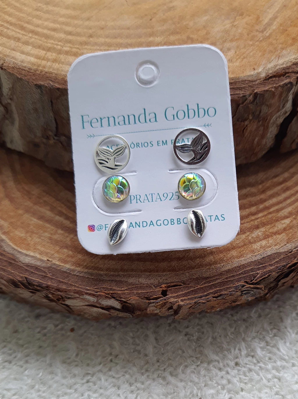 Trio de Brincos com tarrachas tradicionais composto por brinco Cauda Baleia 8mm brinco escama sereia branco Furta-cor 6mm e mini búzui envelhecido 4x6mm.